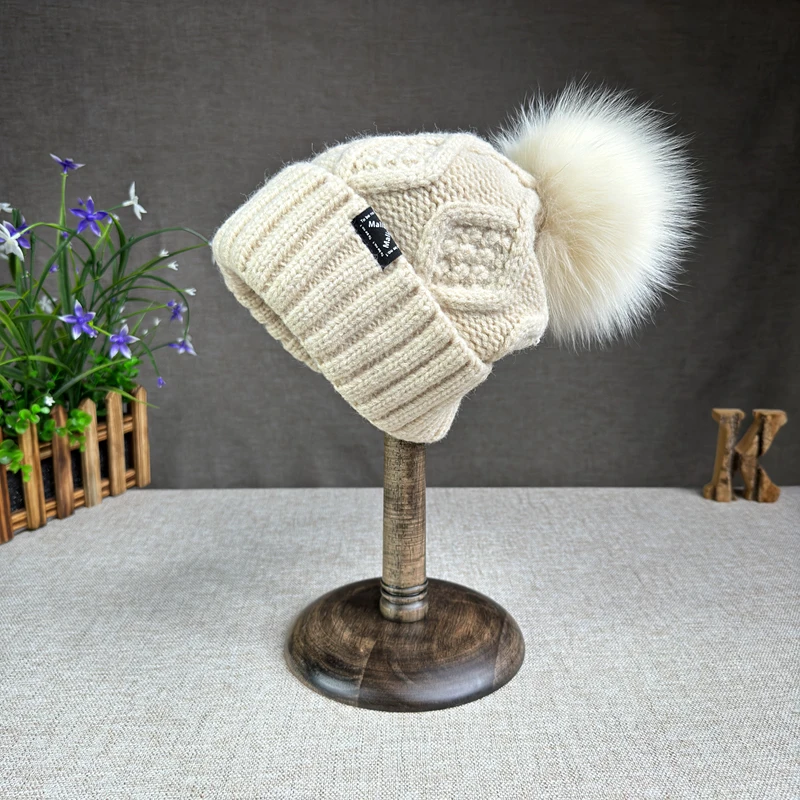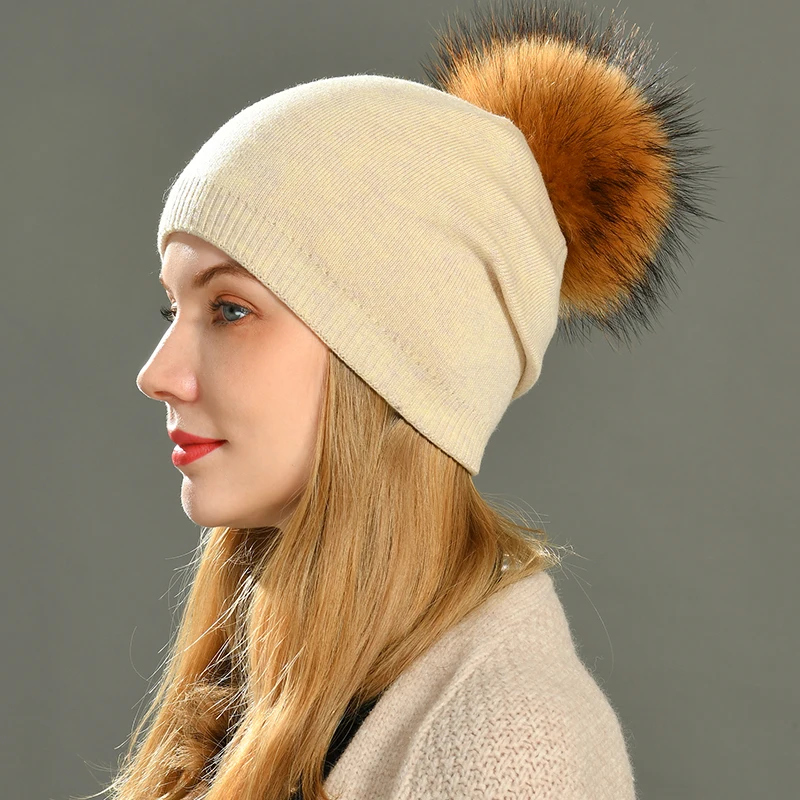 Winter NEW Women Pom Pom Beanies Warm Knitted Bobble Girl Fur Pompom Hats Real Raccoon Fur Pompon Casual Hat Cap