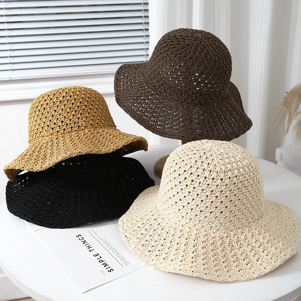 Summer Beach Sun Hat Women Portable Folding Wide Brimmed Straw Hat Fashion Shaped Hollow Top Straw Hat Girls Bucket Hats Travel