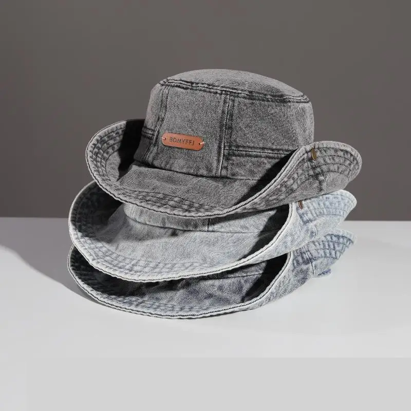 Vintage Washed Denim Bucket Hat Women Men Unisex Wide Brim Sun Hat for Outdoor Hiking Beach Western Style (Light Blue) Sunshade