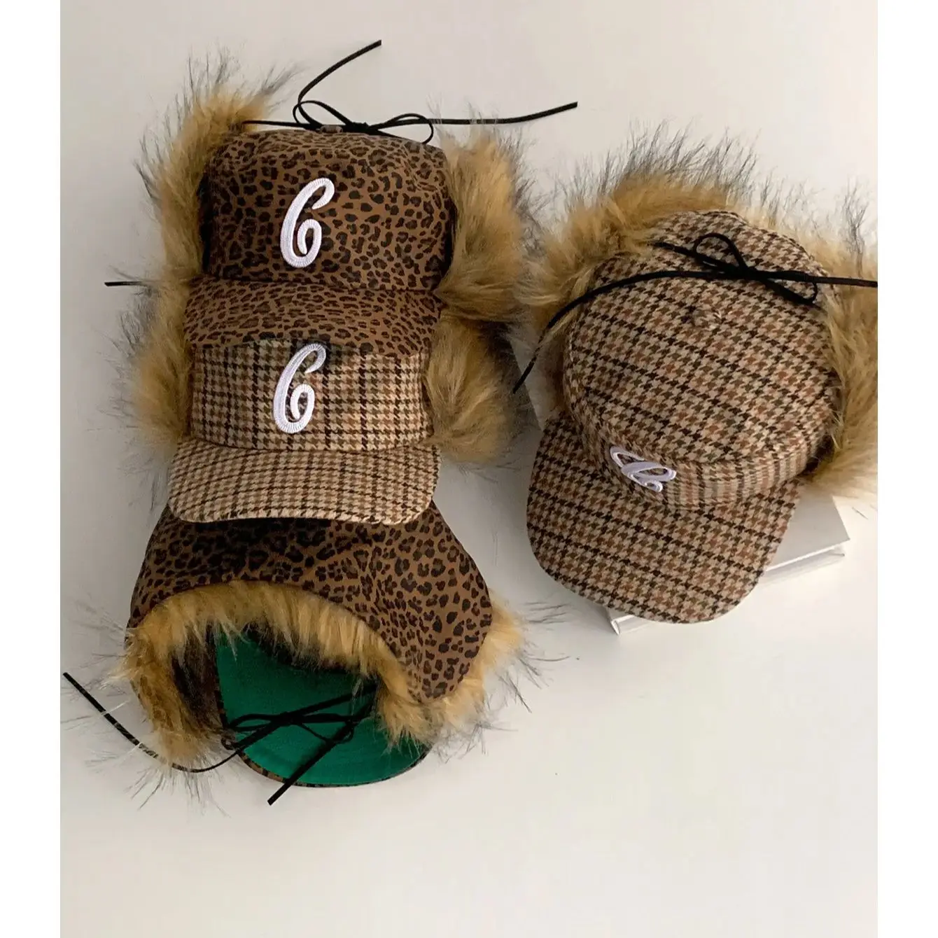 Leopard Print Plaid Lei Feng Hat for Women, Faux Fur Ear Protection Aviator Hat, Winter Warm Flat Top Flat Brim Baseball Cap