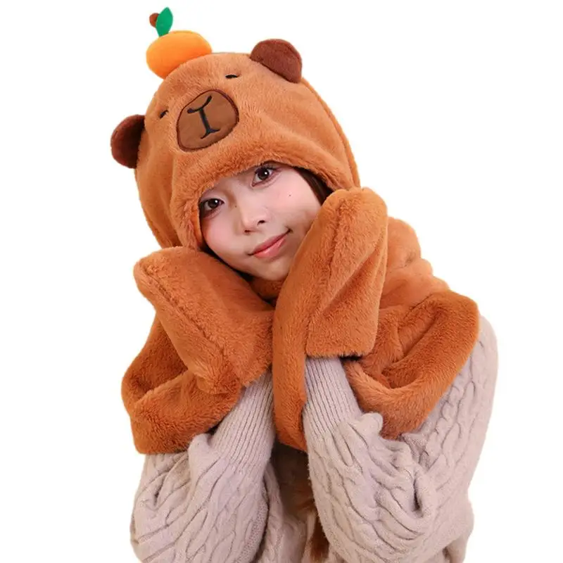 3 In 1 Cute Capybara Hat Scarf Gloves Set Warm Capybara Plush Hooded Scarf Beanie Caps Perfect Winter Gift For Women Girls