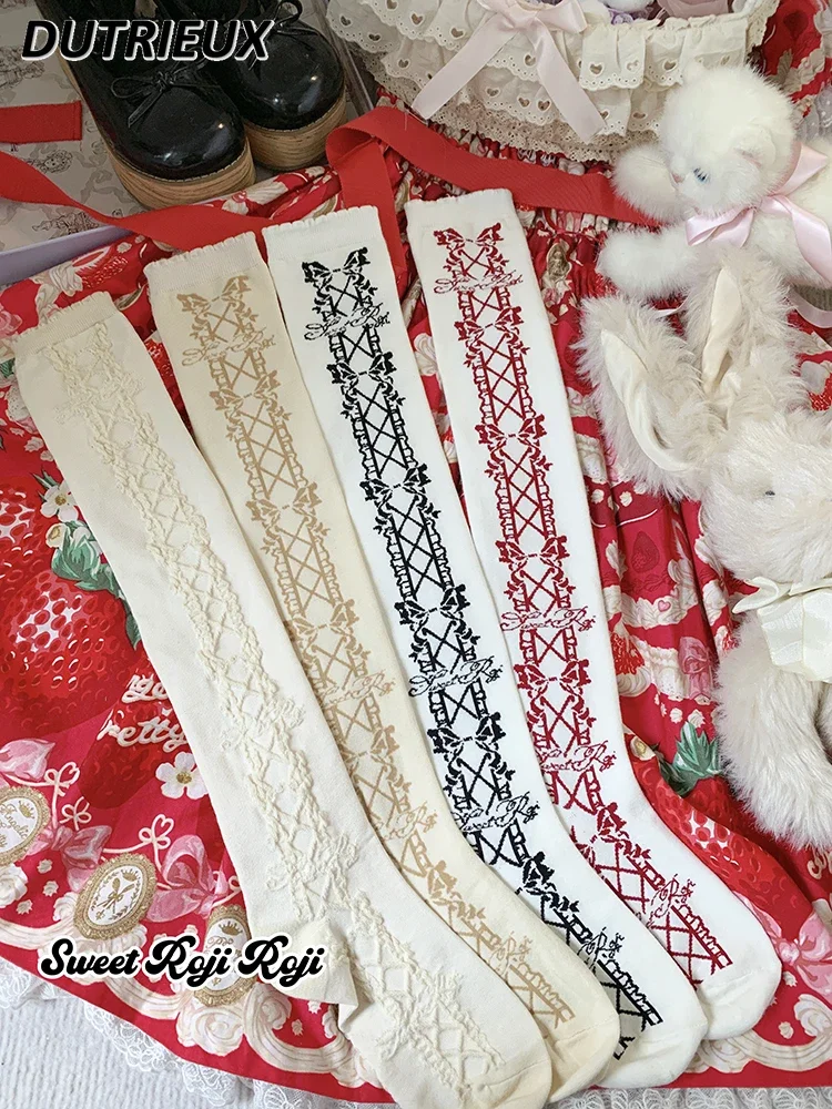 Rojita Bow Cotton Lolita Long Stocking Women's Autumn Warm Uniform Japanese Sweet and Cute Girls Print Versatile Knee High Socks