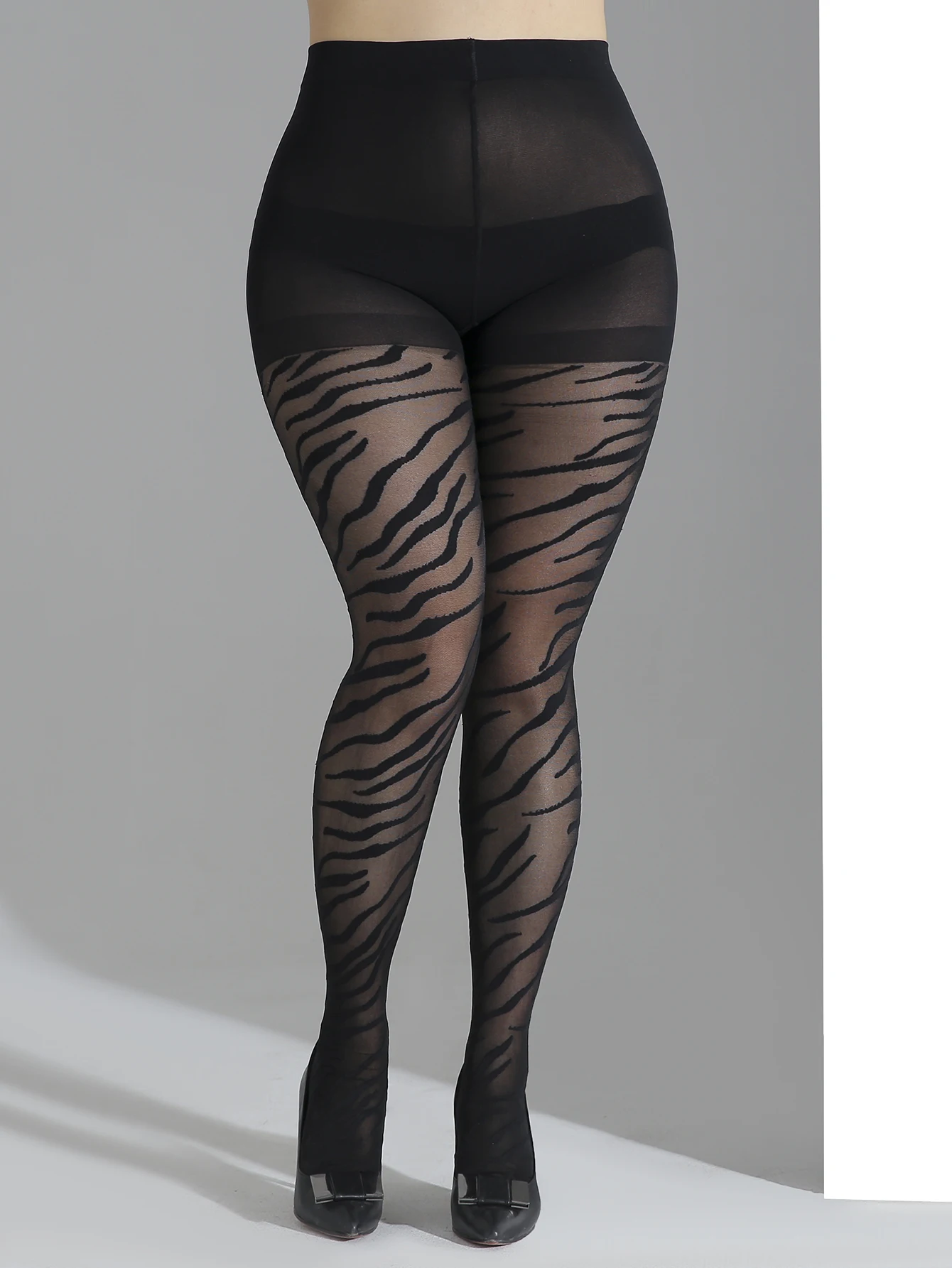 Large Size Zebra Print Black Pantyhose, High Waist Semi-Sheer Footed Pantyhose, Women's Stockings & Hosiery
