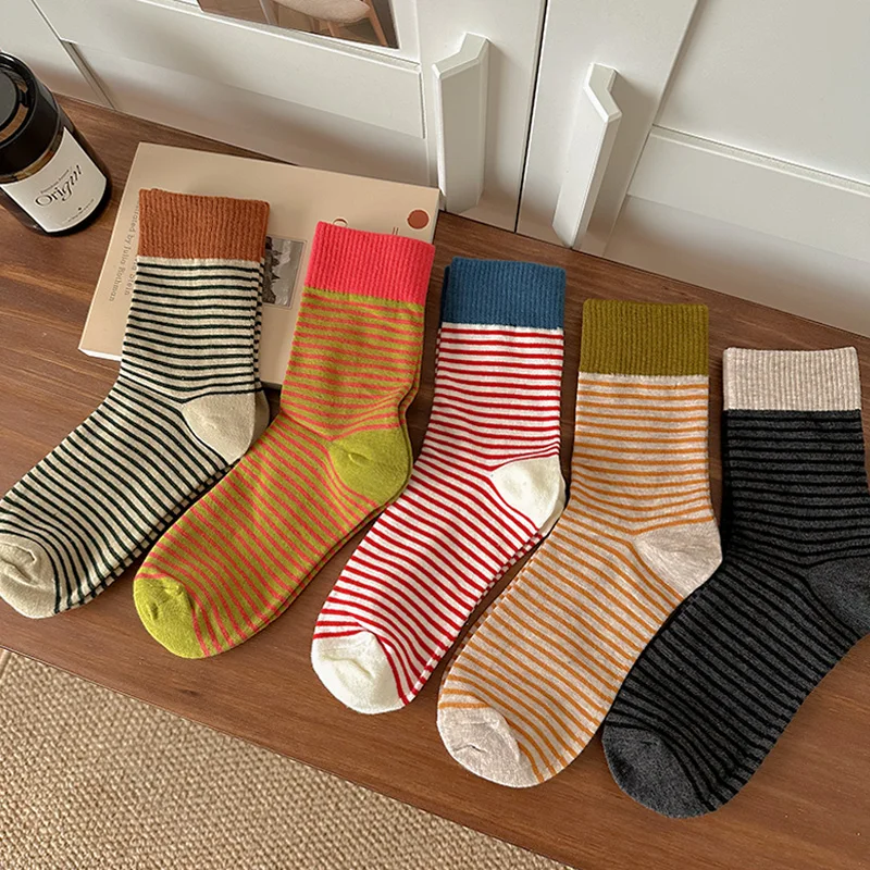 5 Pairs Mid Tube Striped Crew Socks, Casual College Style Women's Stockings & Hosiery