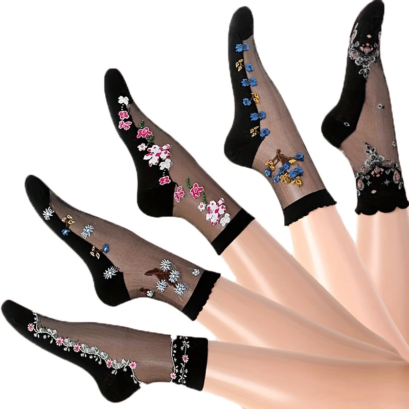 5 Pairs Mesh Floral Print Mid Tube Socks Crystal Glass Short Thin Socks Women's Stockings Hosiery Crystal Glass Short Thin Socks