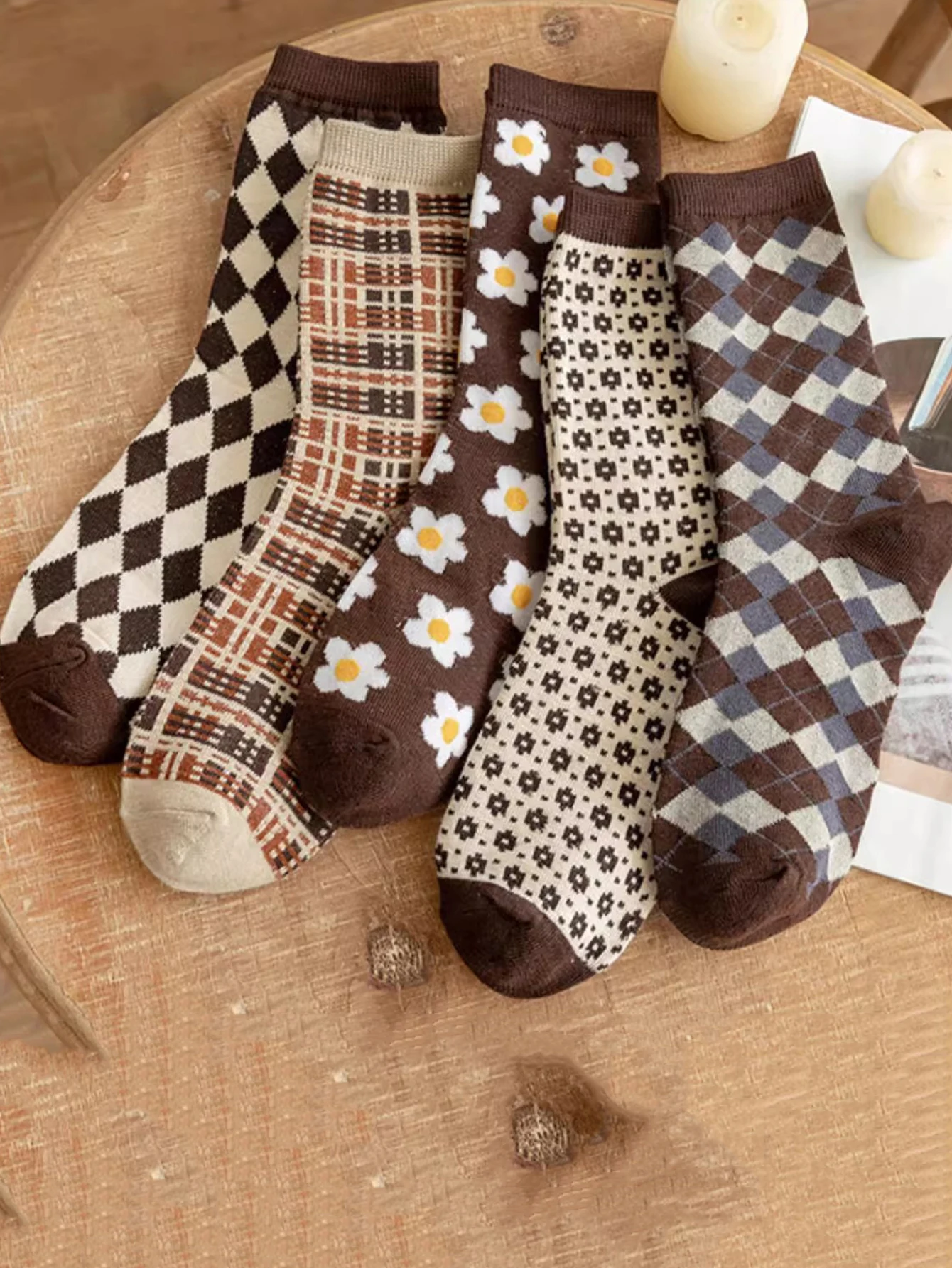 5 Pairs Women Argyle Comfortable Crew Socks Floral Print Fashion Middle Tube Short Socks Set Pack Christmas Gift Soft Floor  Read more