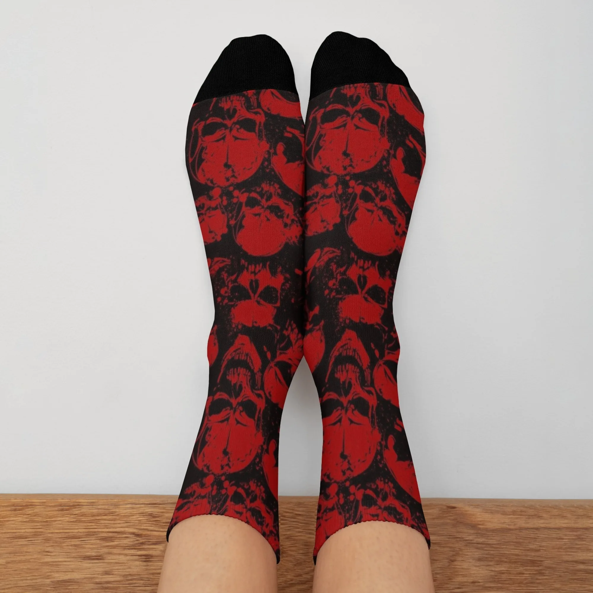 Crazy Dark Red Skull Print Men Women Crew Socks, Gothic Style Horror Novelty, Ideal for Halloween & Casual Street Fashion Gift