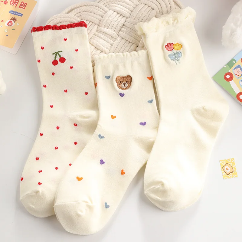 Women Socks Cotton Ins Tide Wholesale Cartoon Bear Cherry Flower Embroidery Cute Kawaii Thin Lolita Ruffles Socks For Girls Gift