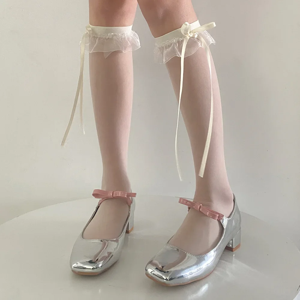 Summer Ultra-thin Transparent Nylon Long Socks Stockings JK Lolita Lace Ruffles Knee Socks Japanese Style Ribbon Bow Stockings