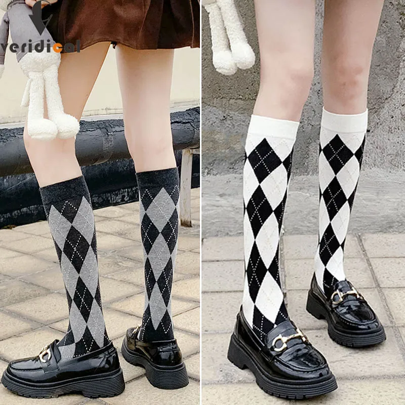 Long Socks Women Stockings Organic Cotton Diamond Warm Thigh High Ladies Girls Street Fashion Young Casual Knee Socks Harajuku