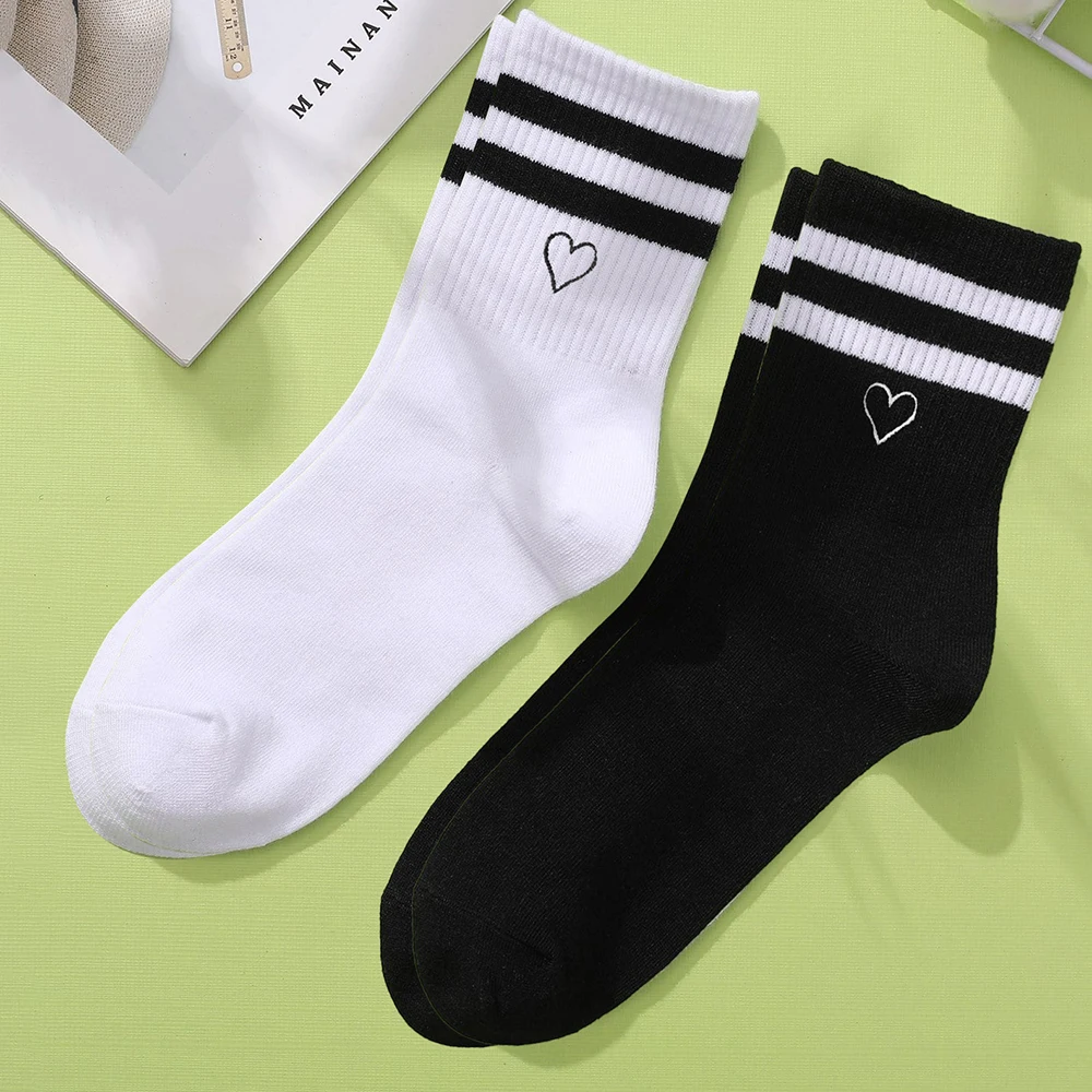 2 Pairs Popular Parallel Bars Mid Length Socks Women's Autumn Fashion Embroidery Love Pattern Breathable Black White Girls Socks