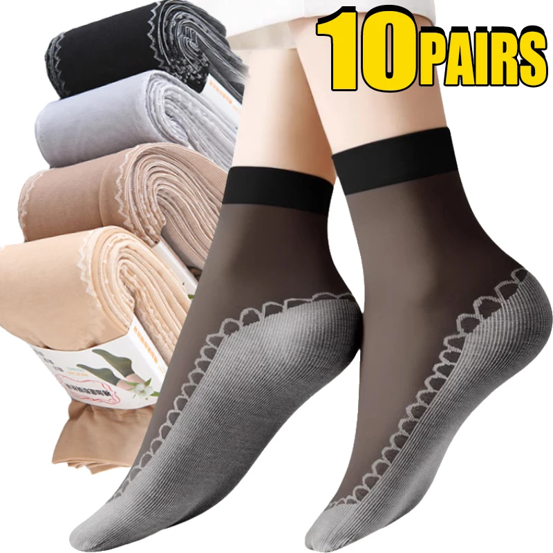 1/10pairs Silk Velvet Ankle Short Sox Elastic Lace Socks Women Transparent Ultrathin Female Mesh Non-Slip Bottom Splice Sock