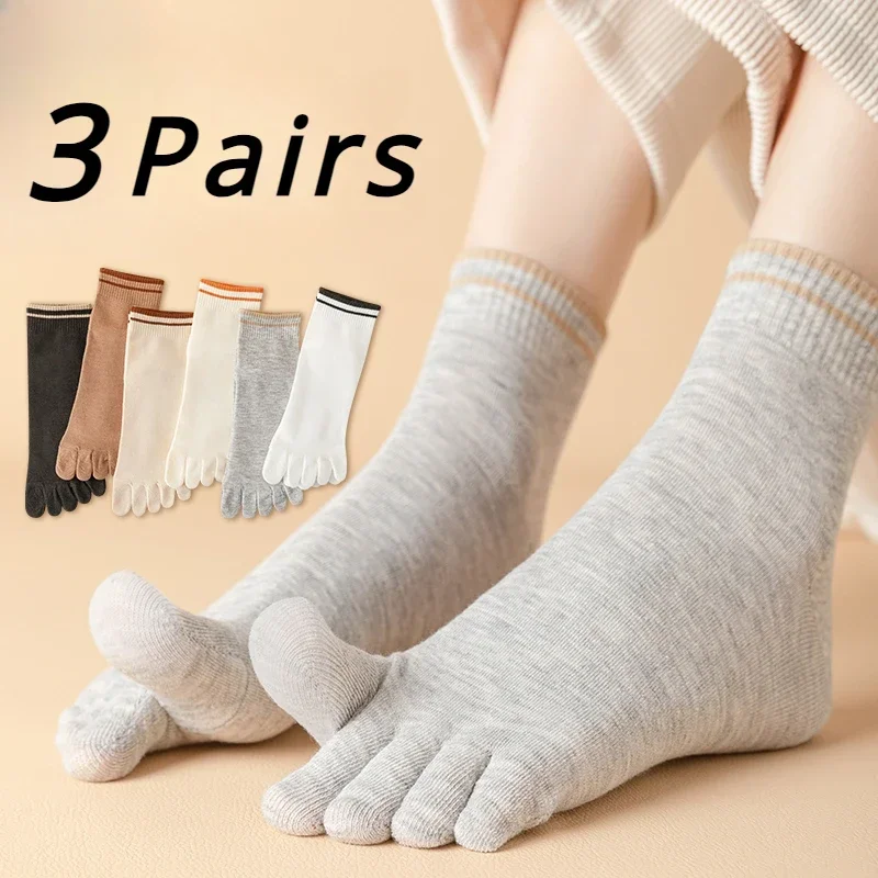 3 Pairs Five Finger Socks Women Yoga Pilates Cotton Socks with Separate Fingers Calf Crew Socks Midi Tube Spring Autumn
