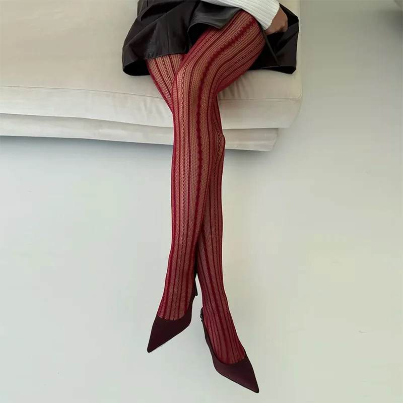Vintage Red Lace Fishnet Pantyhose Women Hollow Diamond Shape Elastic Vertical Stripe Long Stockings Girls Crochet Hook Tights