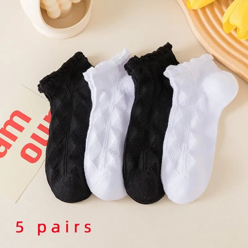 5 Pairs of Trendy WOMEN'S Casual Mesh Breathable Pure Cotton Socks, Girls' Short Tube Socks, Surprise Lace
