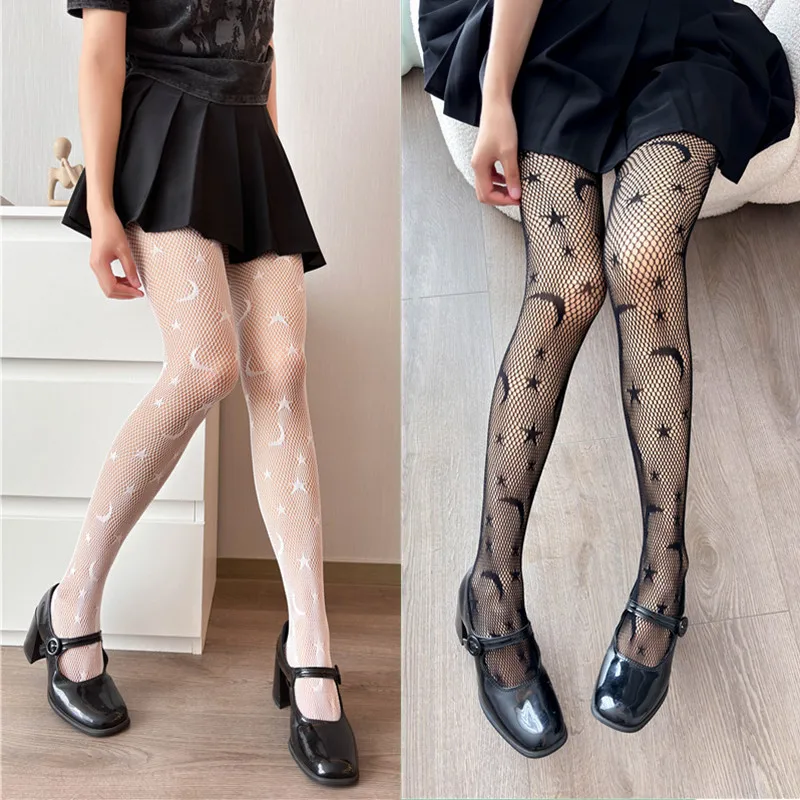 Kawaii Gothic Hollow Out Pantyhose Moon & Star Pattern Fishnet Waist Mesh Tights Women Spicy Girl Sexy Thin Ins Tide Lace Tights