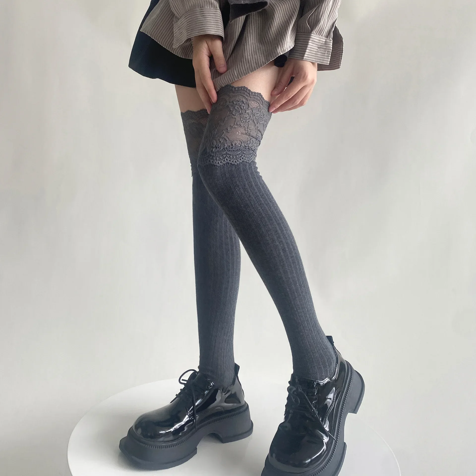 Japanese Fashion Autumn Winter Women Stockings Solid Color Thigh High Socks Lolita Lacework Knee High Socks Thigh High Stockings