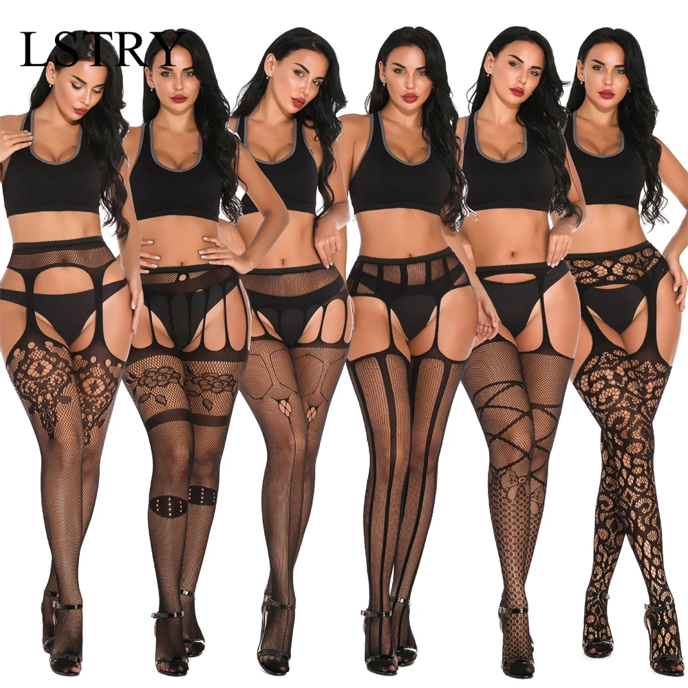 Hot Sexy Women Fishnet Stockings With Garter Belt High Waist Transparent Tights Women Lingerie Crotchless Pantyhose Plus Size