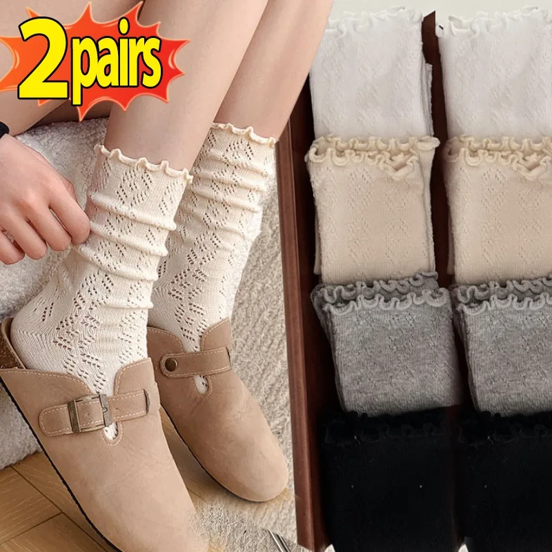 1/2pairs Lolita Retro Sweet Beige Pile Socks Women Mesh Hollowed Thin Silk Retro Flower Lace Socks Ladies Transparent Crew Socks