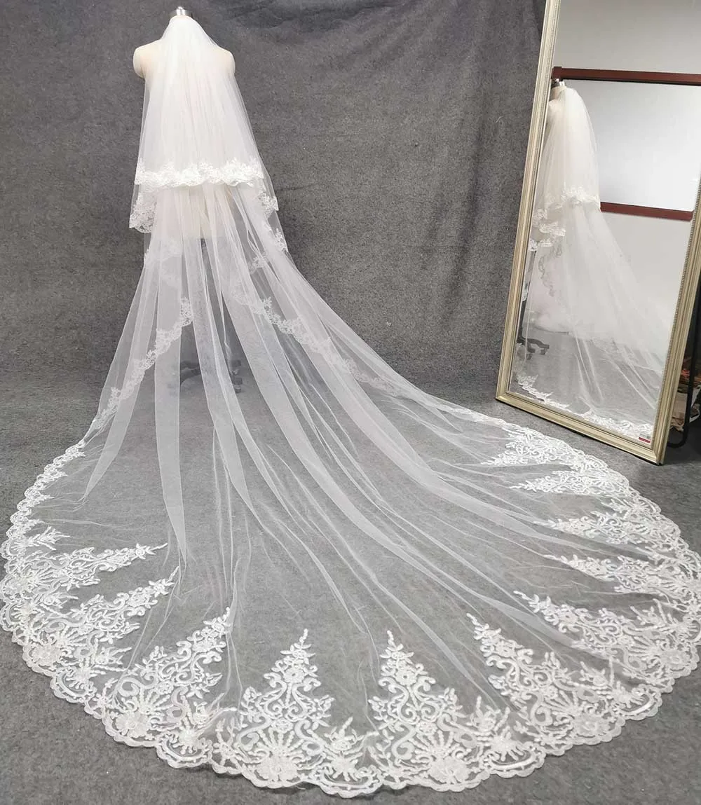 Customized 2 Layers Long Lace Wedding Veil with Comb Real Photos 3m/4m/5m Bridal Veils with Blusher 2T Bride Veil