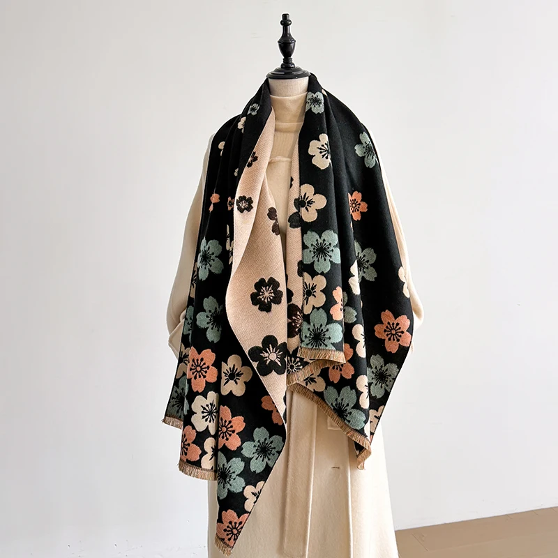 2025 New Luxury Women's Double-Sided Print Pashmina Flower Scarf - Soft Warm Winter Outdoor Cold-Resistant Windproof Shawl