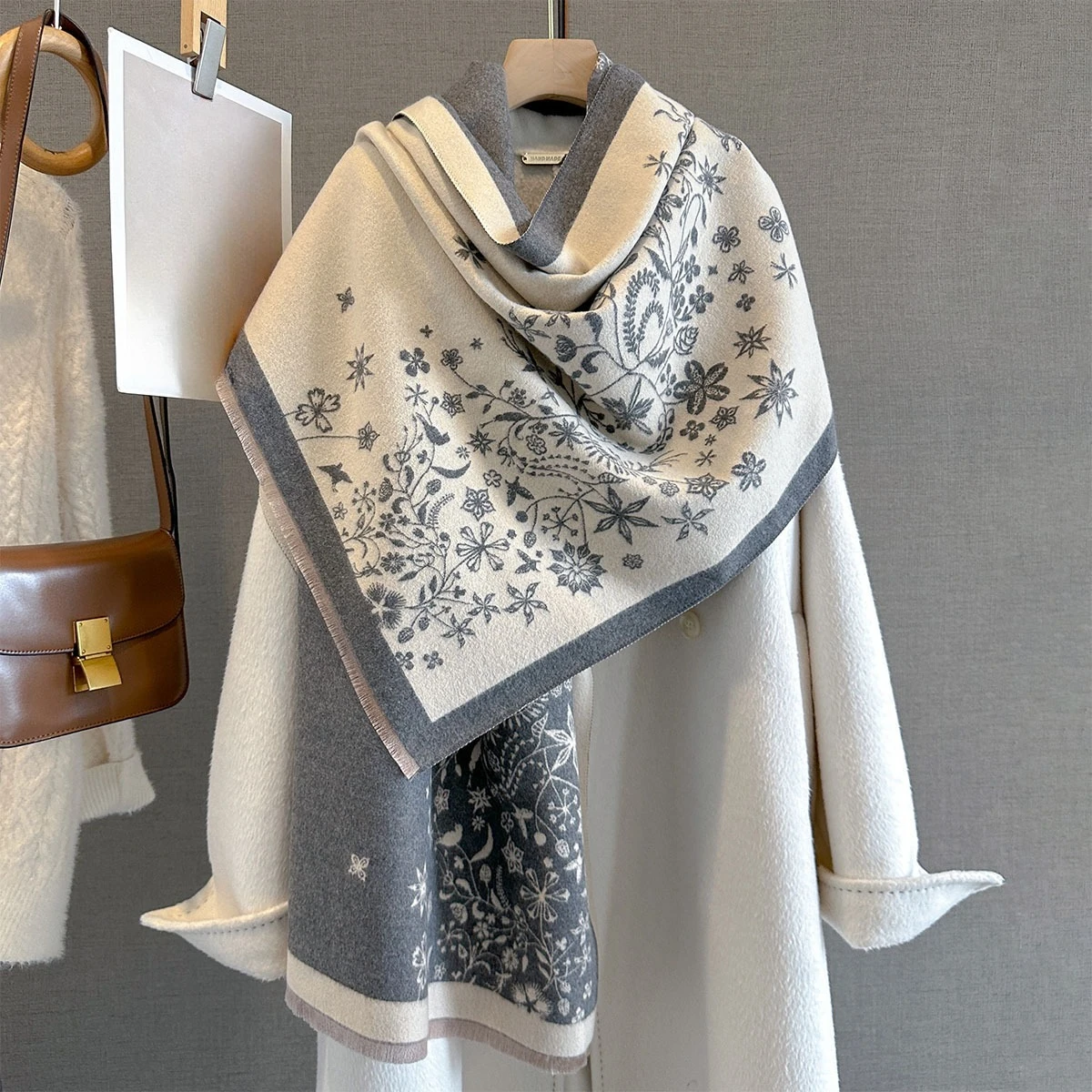 Elegant Floral Bouquet Scarf Imitation Cashmere Soft Warm Versatile Shawl Coldproof Windproof Blanket Scarf for Autumn Winter