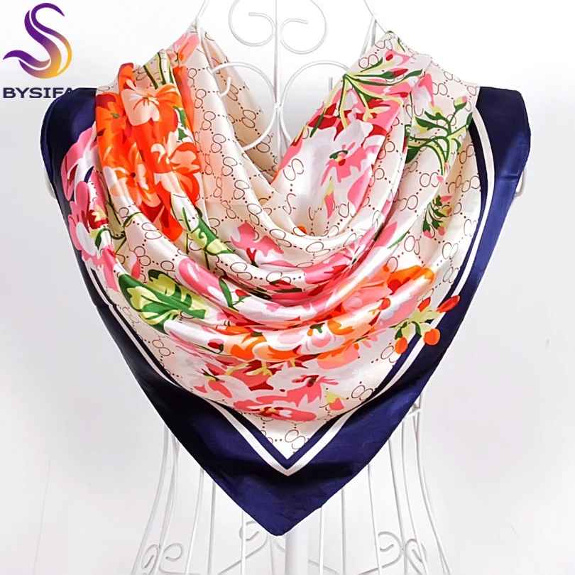 BYSIFA Women Satin Silk Scarf Hijab Brand Blue Pink Red Floral Pattern Square Scarves Wraps Spring Autumn Muslim Head Scarf Cape
