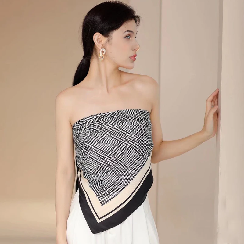 Square Simulated Silk Scarf Women Satin Plaid Print Hijab Scarves Muslim Pareo Bandana Female Shawl Wrap Headband Foulard 90cm