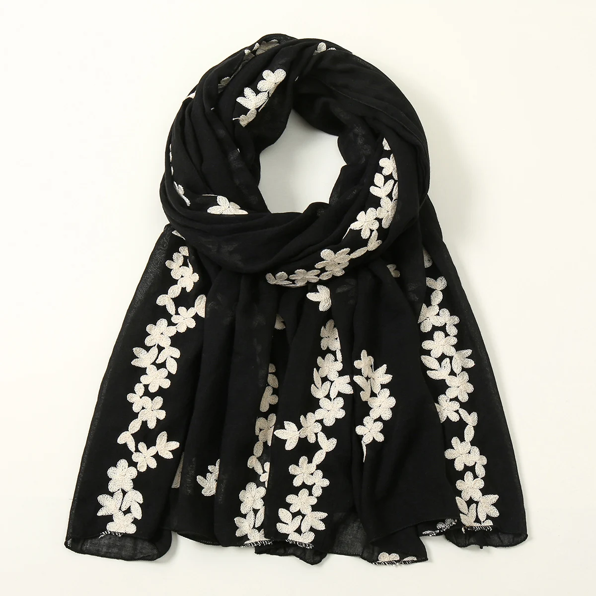 Fashion Embroidery Floral Long Scarf Hijab Woman Cotton Shawl Summer Solid Color Wraps For Ladies Casual Stole Headband 180*80cm  Read more