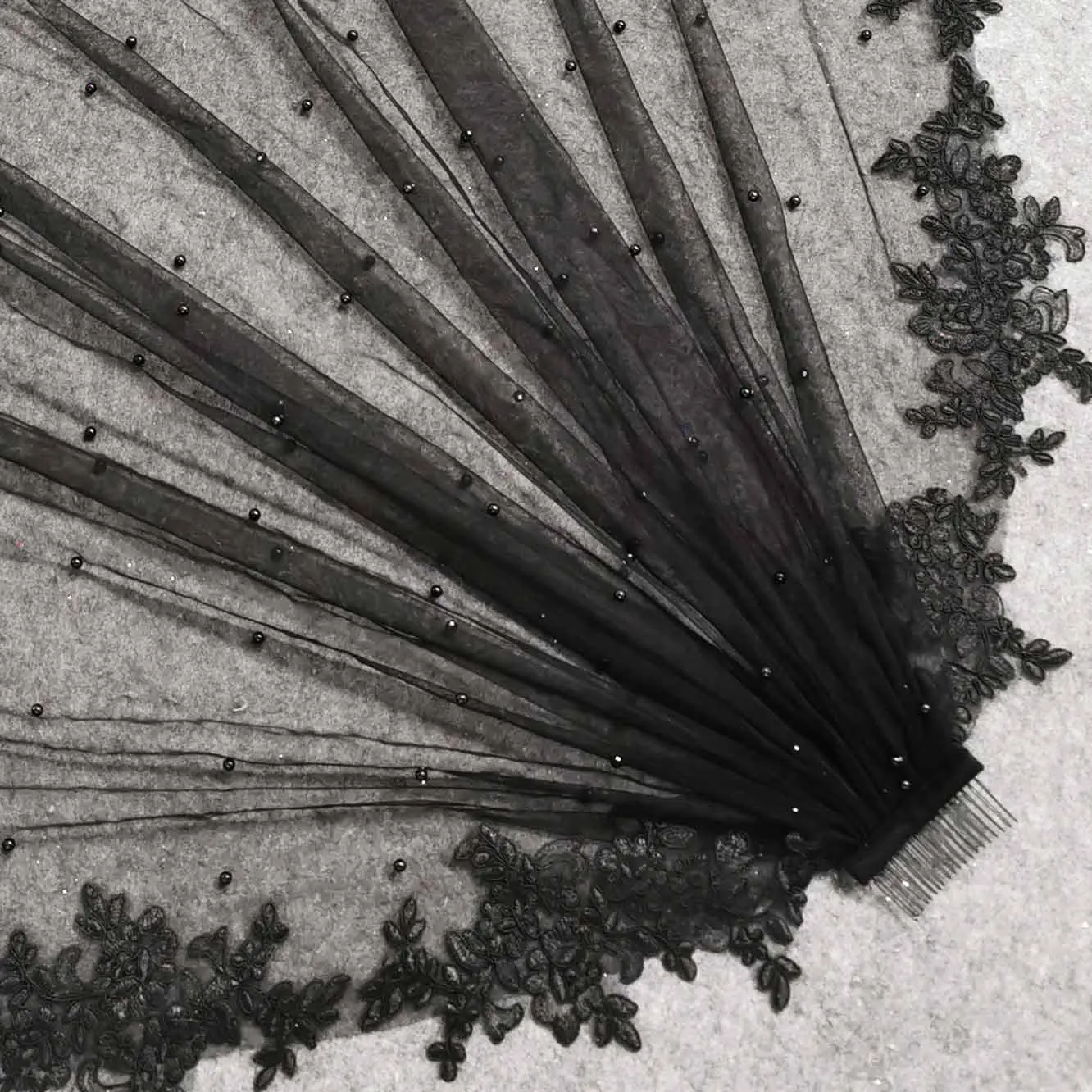 Customized Black Pearls Lace Wedding Veil Short Bridal Veil with Comb One Layer 1M Veil for Bride Velos de Novia
