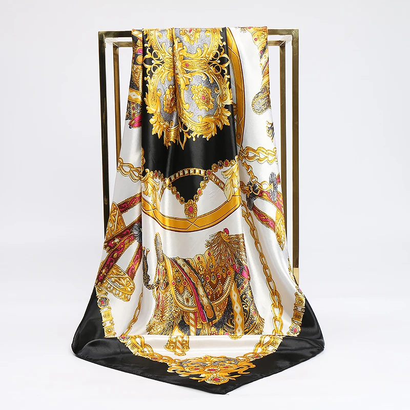 Summer Chain Printed Hijab Bandana Square Satin Silk Scarf For Woman Sun Protection Turban Muslim Laides Turban Headband 90*90cm  Read more