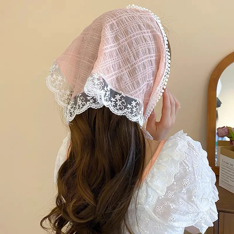 Lace Triangle Scarf Pink Turban Bandage Bandana Headbands Women Retro Party Travel Hair Accessories Headwear Fashion Headwarps