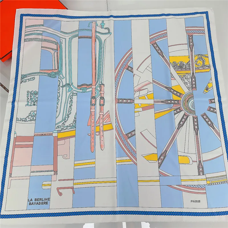 90CM Manual Hand Rolled Twill Silk Scarf Women Wheel Stripes Chain Print Square Scarves Wraps Femme Bandana Lady Hijab Shawl