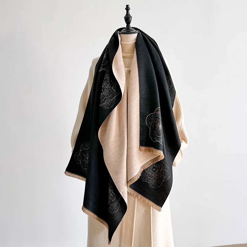 New Women's Fashion Faux Cashmere Winter Scarf Vintage Print With Tassels Thick Warm Pashmina Two-Sided Wrap Outdoor Shawls Foul