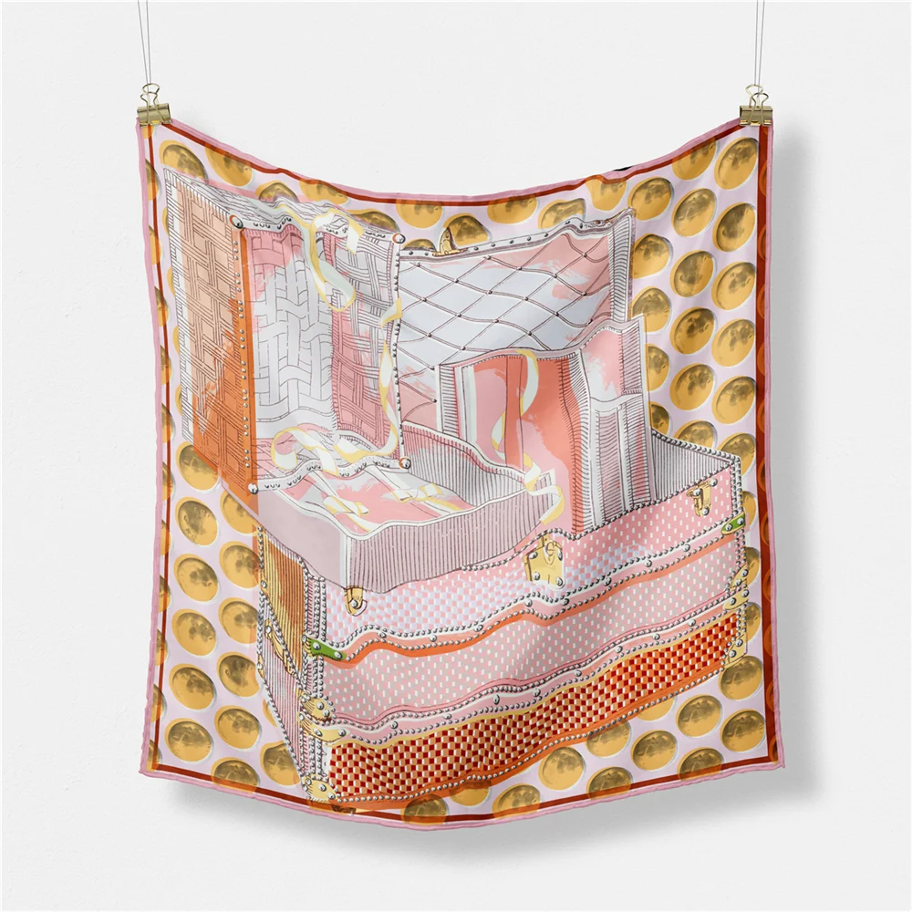 POBING Hand Rolled Twill Silk Scarf Women Horse Carriage Double Print Square Scarves Wraps Echarpes Foulards Femme Hijab 90CM