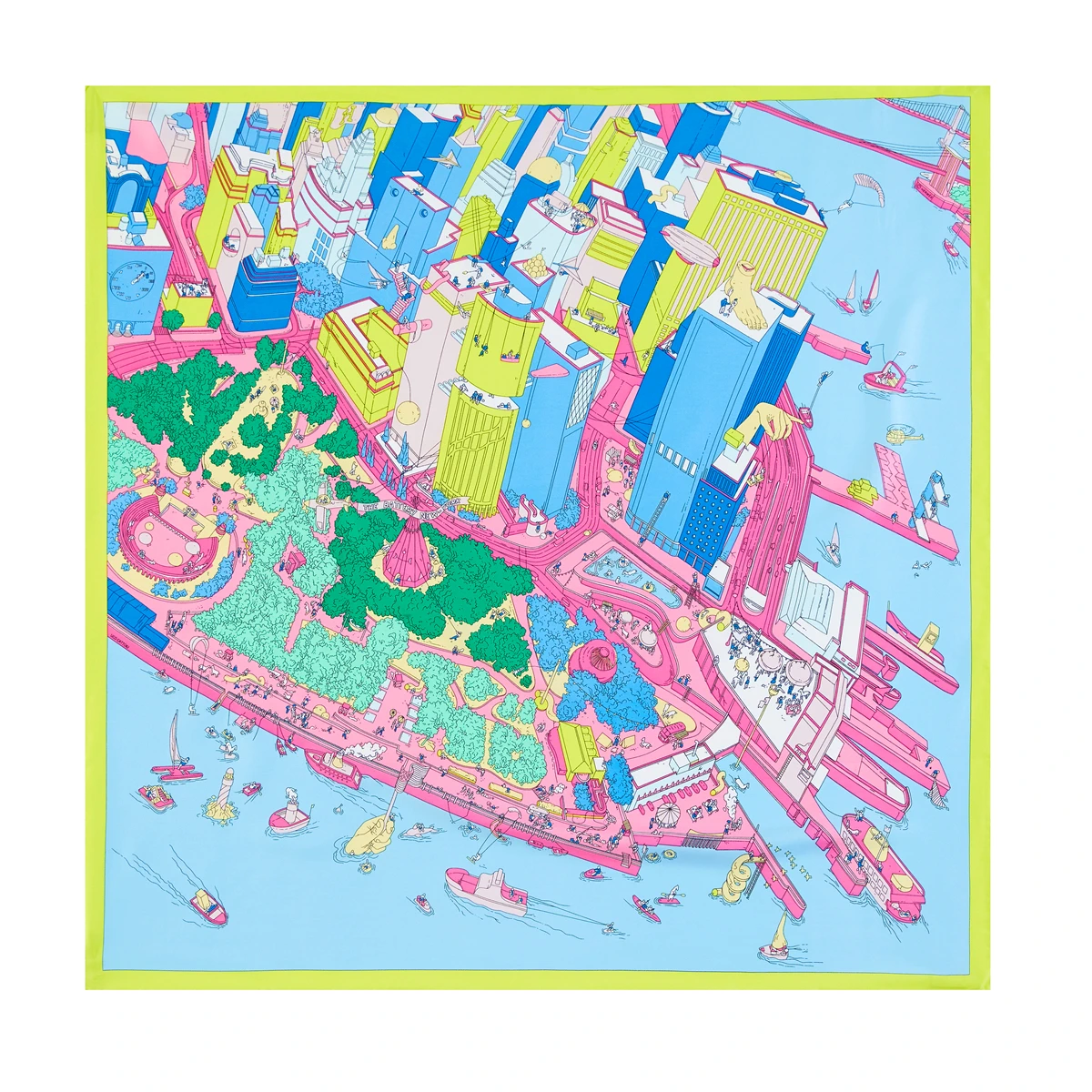 90cm “Beach City” Foulard Twill Silk Scarf Women Square Shawl Brand Hijab Scarf Bandana Leopard Handmade Curled Head Scarves