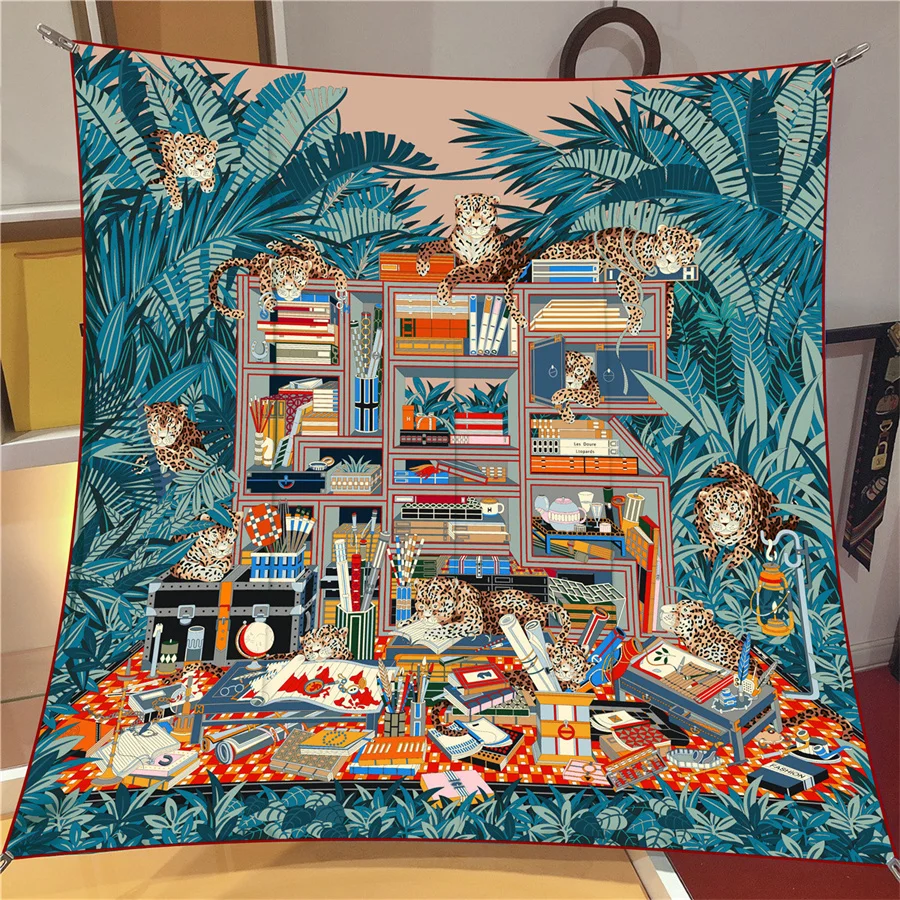 90cm Bookshelf Leopard Brand Square Scarf Women Twill Silk Scarf Shawl Hijab Luxury Bandana Foulard Neckerchief Head Scarf