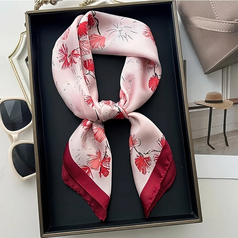 27.6inch Elegant Floral Print Square Scarf Soft Satin Neck Scarf Fashion Accessory Professional Versatile Small Scarf