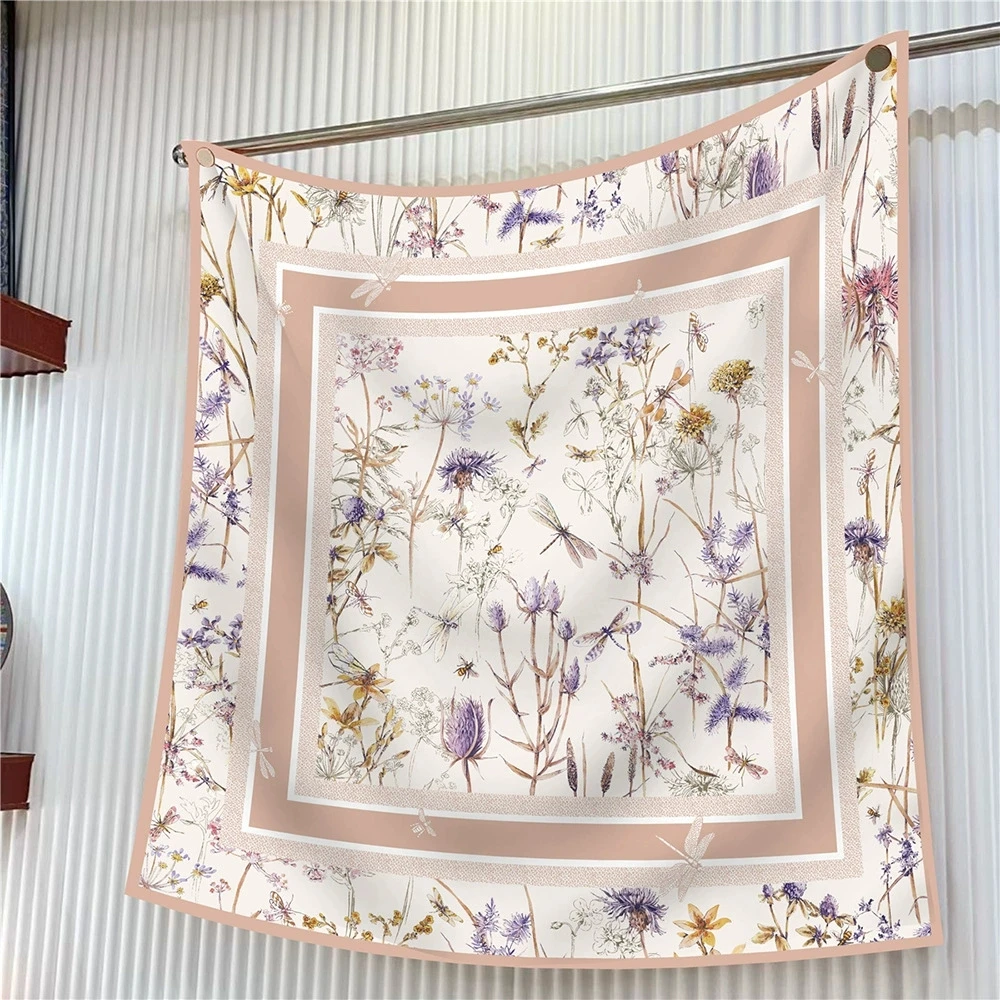 Twill Silk Scarf Shawl Luxury Brand Flowers Plants Print Square Scarf Women Hijabs Bandana Foulard Neckerchief Head Scarves 90cm