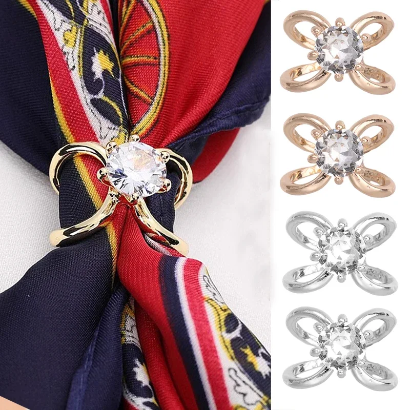 Fashion Rhinestone Scarf Buckles for Women Shiny Crystal Cross Ribbon Silk Scarf Flower Brooch Buckle Ring Clip Jewelry Gift