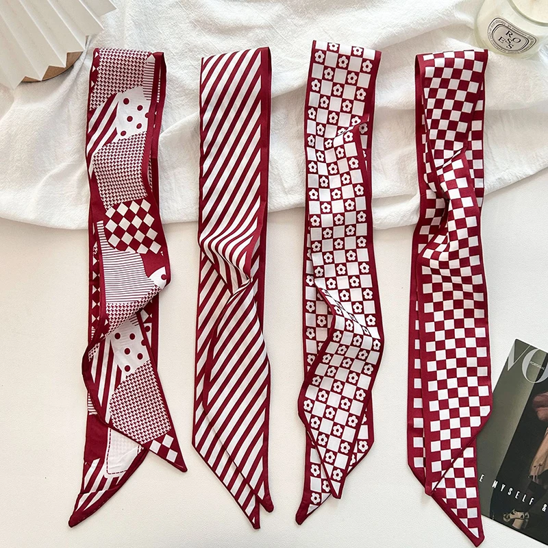 2025 New Luxury Brand Scarf Red Stripe Printing Women Scarf Bag Hair Skinny Silk Scarves Lady Foulard Neckerchief Headband