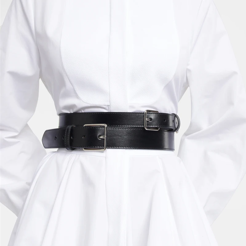 Double needle silver buckle cowhide waist seal, women's leather wide design waist belt, black 6cm width coat belt
