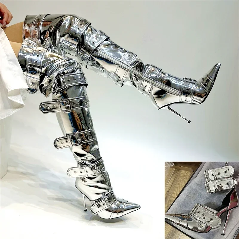 Blue Denim Metal Rivet Buckle Silvery Over Knee Boots Women Sexy Punk Style Silver Belt Buckle 12cm High Heel Sandals Size 34-43