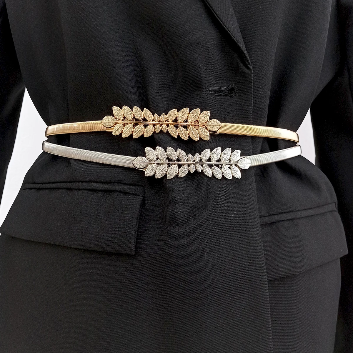 Fashion Elastic Gold Chain Belts For Women High Quaity Luxury Female Waist Silver Metal Corset Belt Stretch Cummerbunds leaf