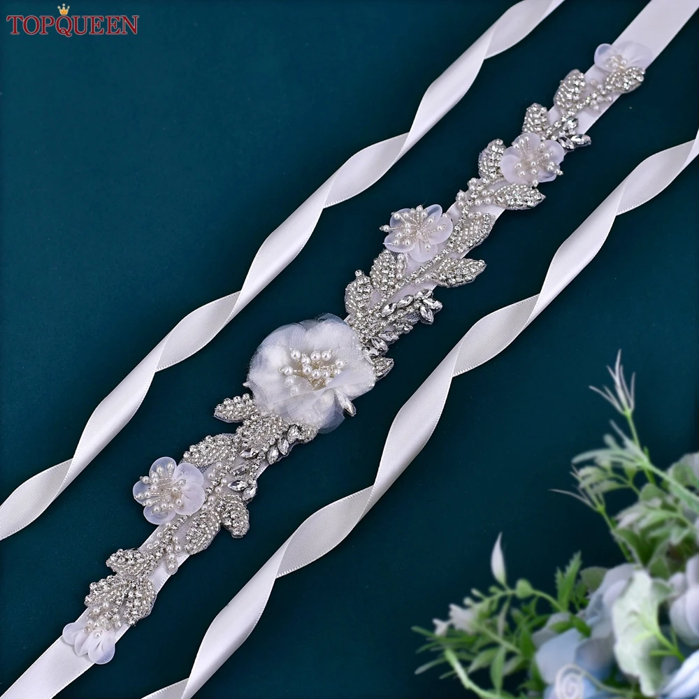 TOPQUEEN Wedding Flowers Belt Pearl Beaded Belt Organza Flower Women'S Belts And Sashes Dress Belt Rhinestone Belt S13
