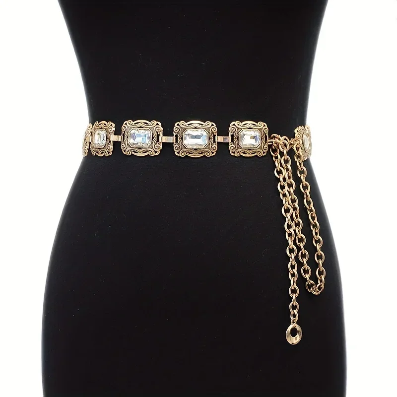 Boho Engraved Metal Chain Belt Rhinestone Inlaid Vintage Waist Chain Women's Coat Dress Tassel Chain Accessories