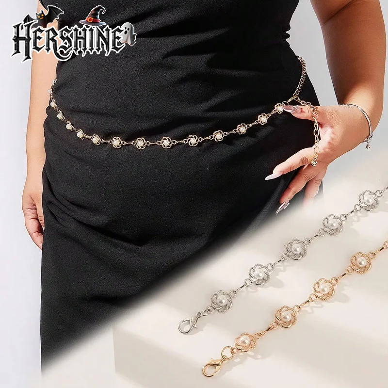 1Pcs Plus Size Ladies' metal inlaid hollow flower shaped pearl waist chain Elegant and sweet style Dress accessories