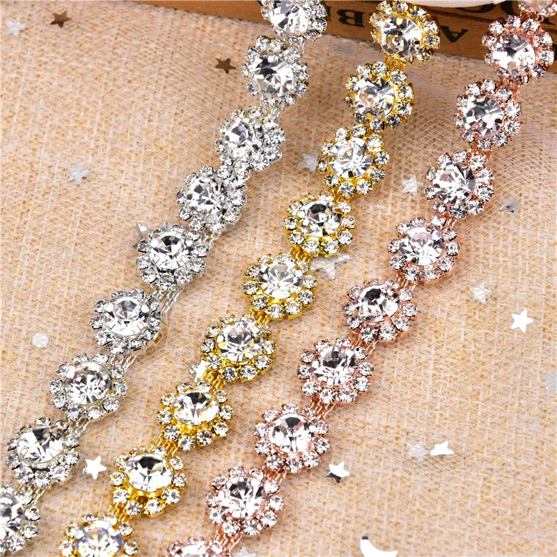 1 Yard Aaa-Grade Flower Crystal Clear Round Glass Rhinestone Cup Chain Rose Gold Base Dress Belt Trim Applique Sew On Garment