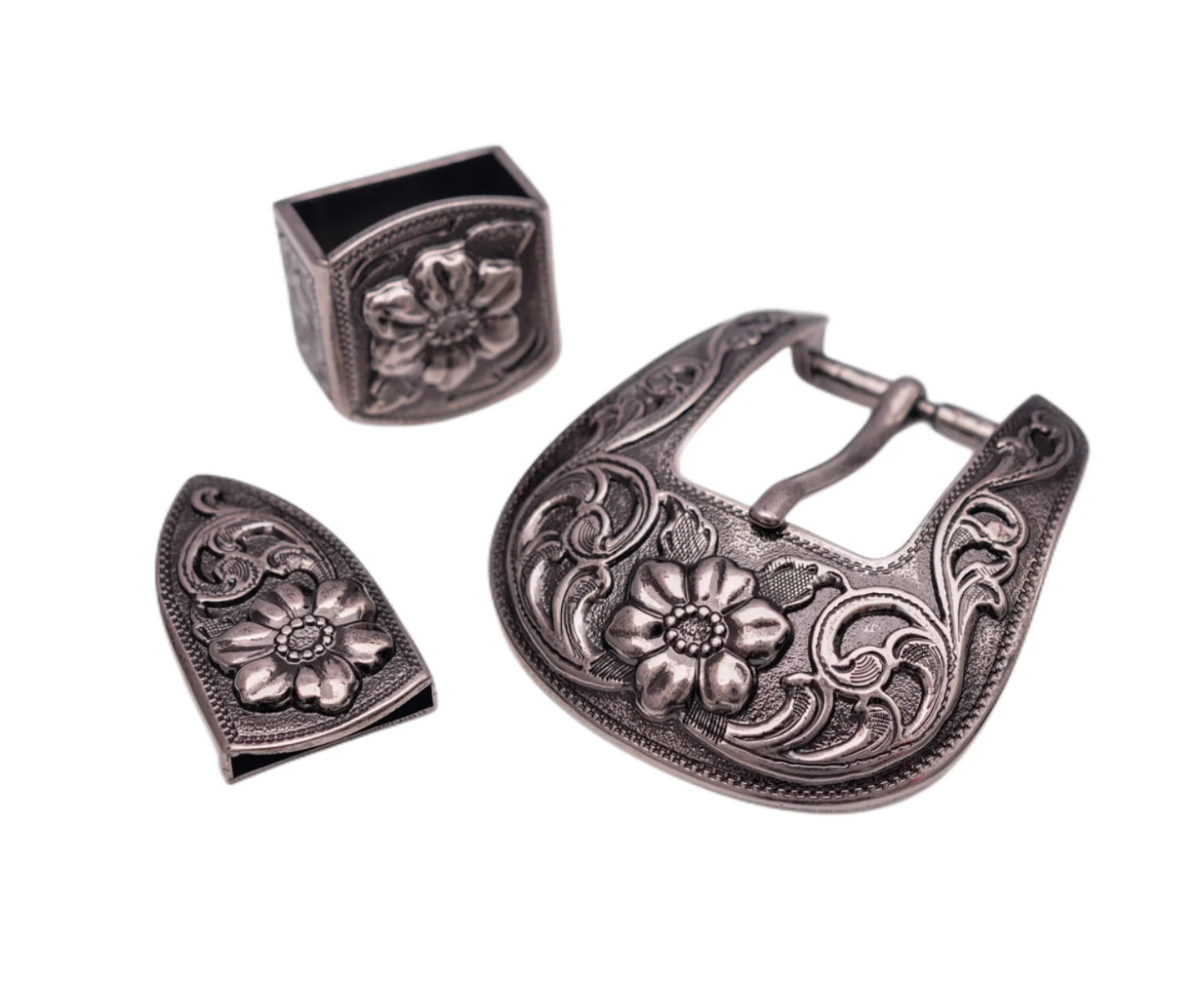 Quality Silver Western Cowboy Cowgirl Rodeo Floral Engraved Leather Belt 3 Pieces Buckle Set Replacement Fit 1" Belt Strap