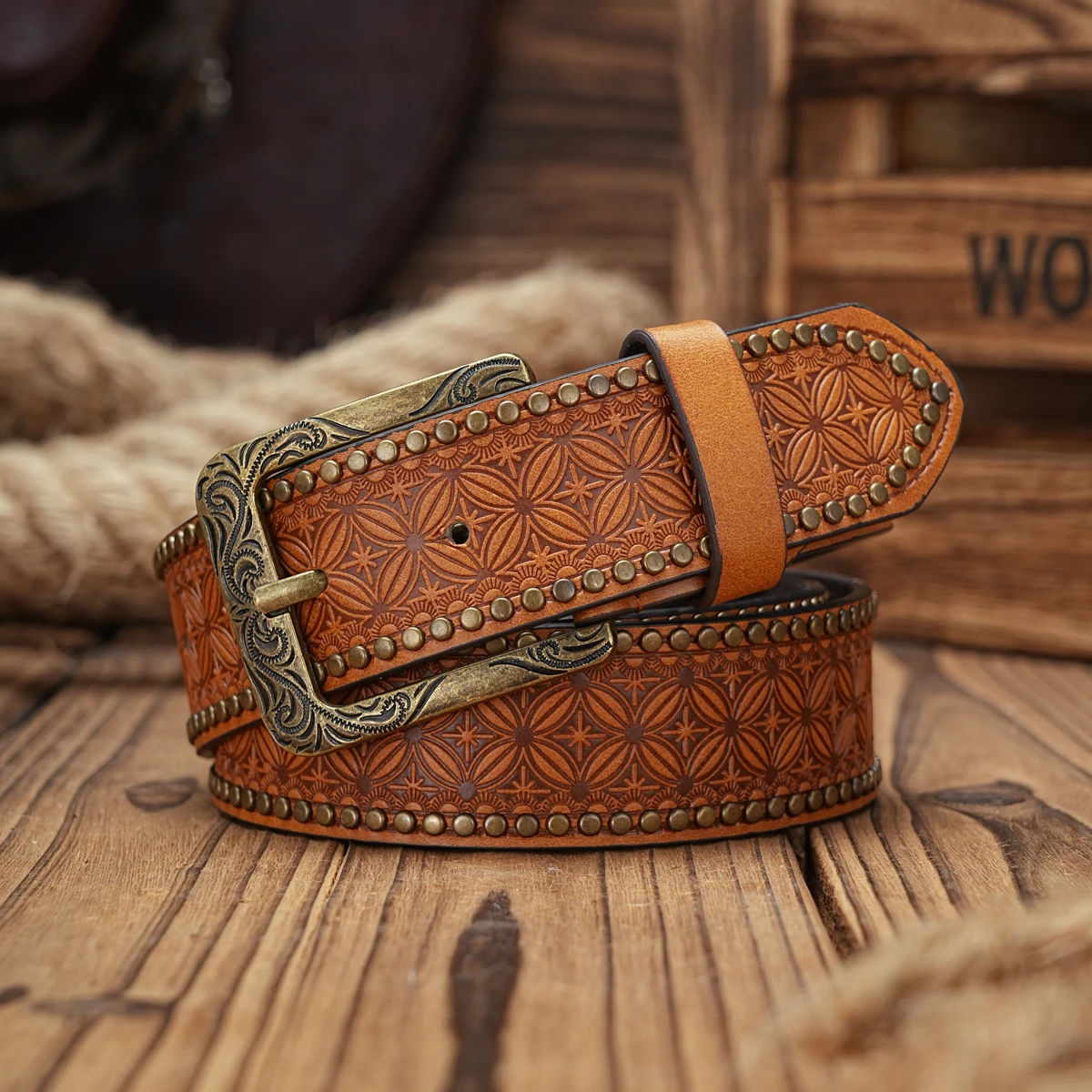 Men & Women-Western-Cowboy-PU Leather-Belts - Vintage horse Belt Floral Engraved Buckle Belt for Jeans